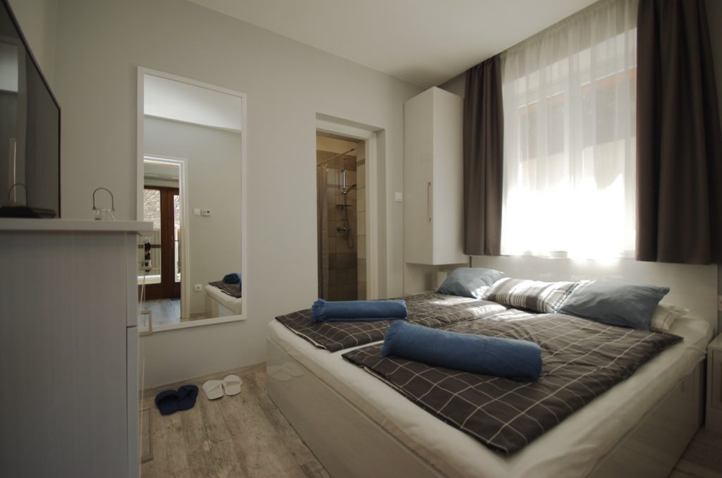 4. Ebben az emeleti apartmanban egy franciaágy található, így 2 fő elhelyezése biztosított. Itt is van konyhasarok és egy zuhanyzós fürdőszoba. A hatalmas teraszról a Híd utca és az AQUApalota épülete látható.