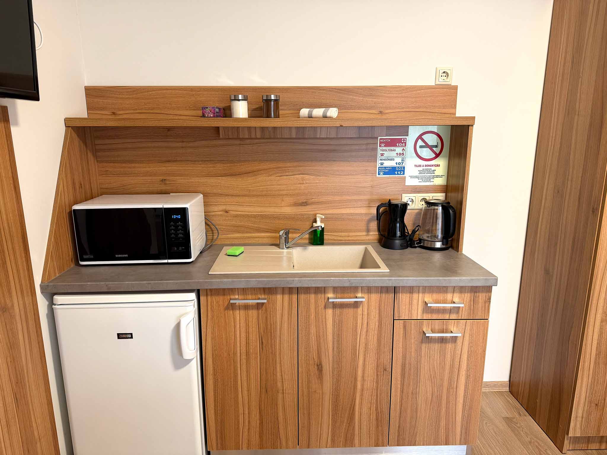 3. Az épület felső szintjén található egylégterű apartmanban egy franciaágy és egy fotelágy található. A helyiség konyhasarokkal ellátott. A szoba befogadó képessége 3 fő. A fürdőszoba zuhanyzós, és az ide tartozó teraszról kellemes kilátás biztosított a környező zöldövezetre.