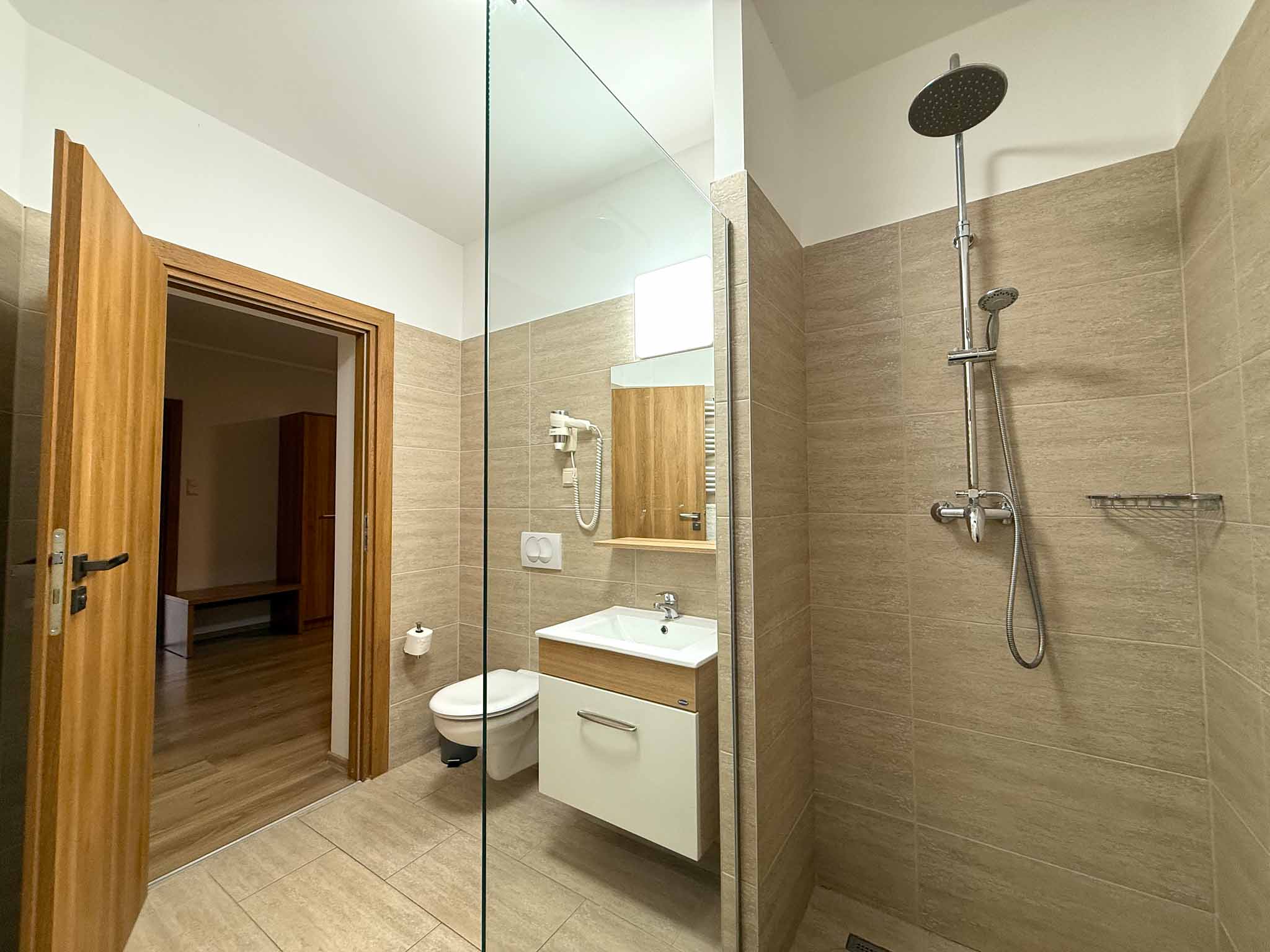 2. A lépcsőházból nyíló földszinti egylégterű apartmanban egy franciágy és egy kanapéágy található, így a szoba kapacitása 3 fő. Az lakrészhez egy hatalmas terasz és konyha is tartozik. Az itt található fürdőszoba zuhanyzós.