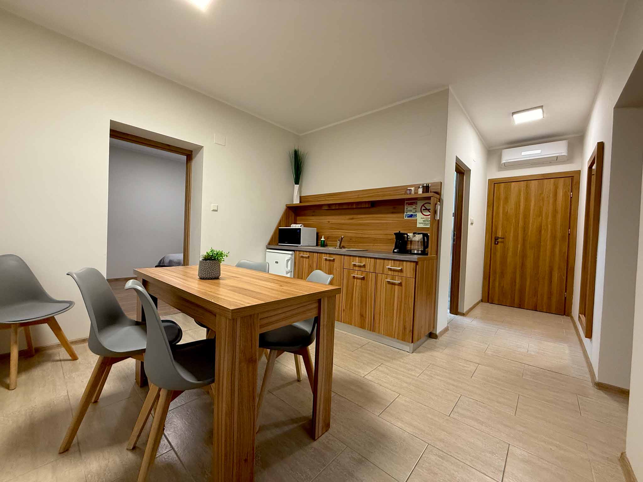 Szálláshelyünkön 5 légkondicionált apartman található, amelyek saját fürdőszobával, és felszerelt konyhával rendelkeznek. A ház különlegessége, hogy minden szobához óriás terasz tartozik. Az udvaron a parkolás ingyenesen biztosított.